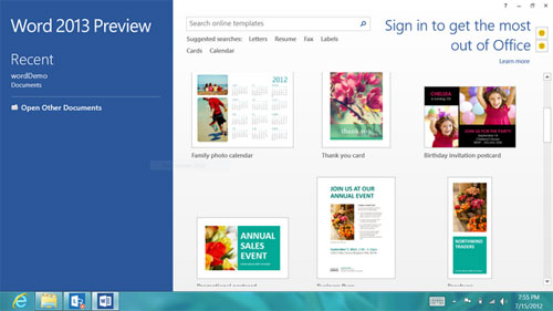 Về giao diện, Office 2013 Customer Preview được thiết kế để hòa hợp theo phong cách của Windows 8, trong đó thanh Ribbon đã được cải tiến nhiều, giúp người dùng dễ dàng sử dụng Office hơn.